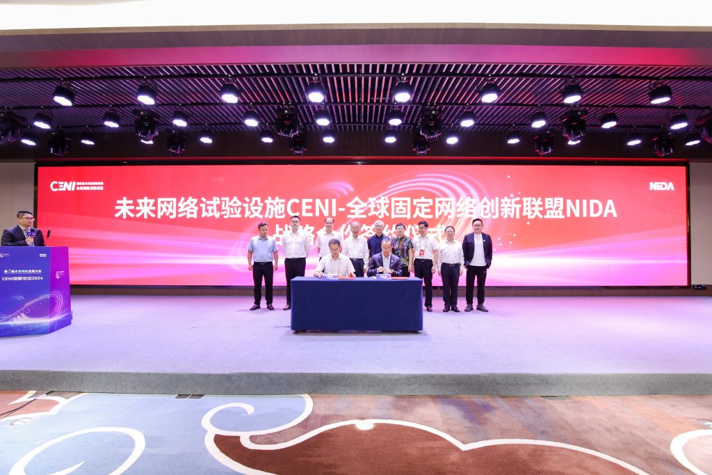 论坛上,江苏省未来网络创新研究院与全球固定网络创新联盟签署了CENI-NIDA战略合作协议,双方将发挥各自优势,共同推动CENI-NIDA联合实验室落地,建设场景化创新示范环境,联合开展课题研究与技术攻关,加速下一代互联网Net5.5G的发展和应用。